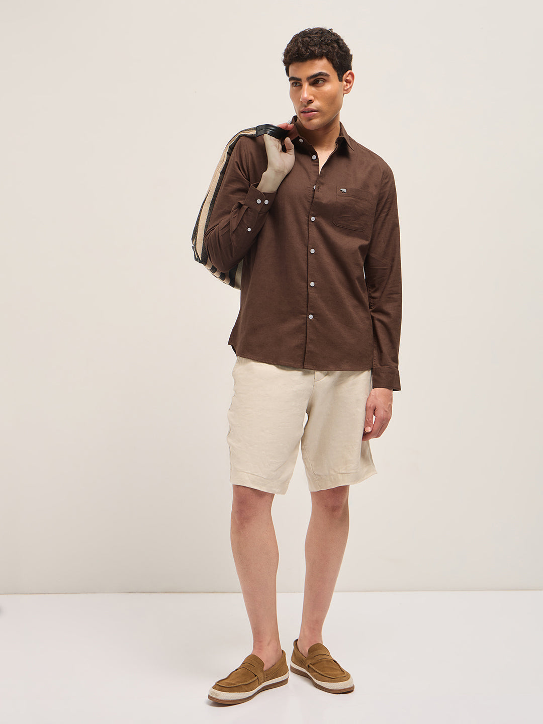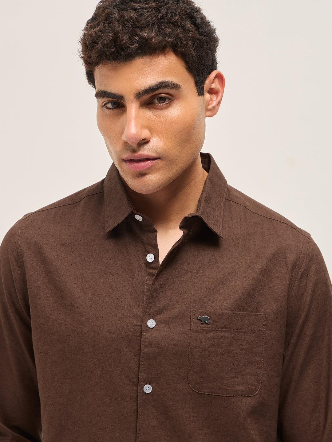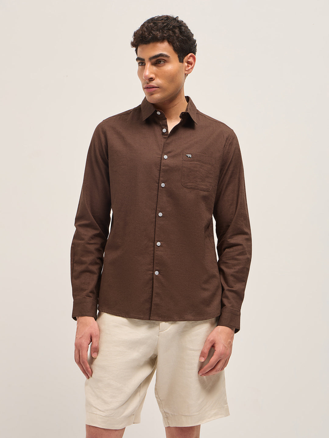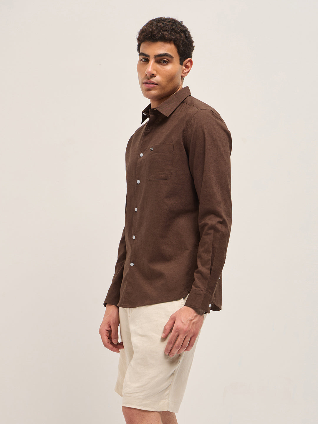 Brown Cotton Linen Slim Fit Solid Casual Shirt